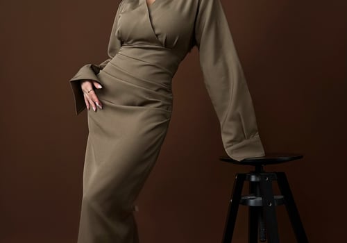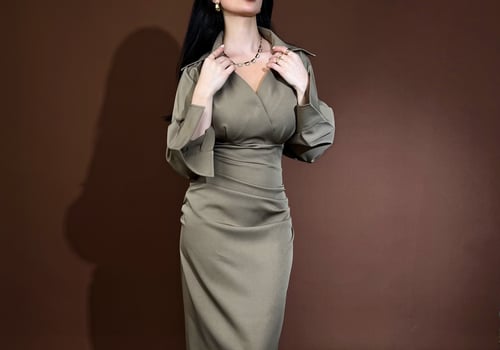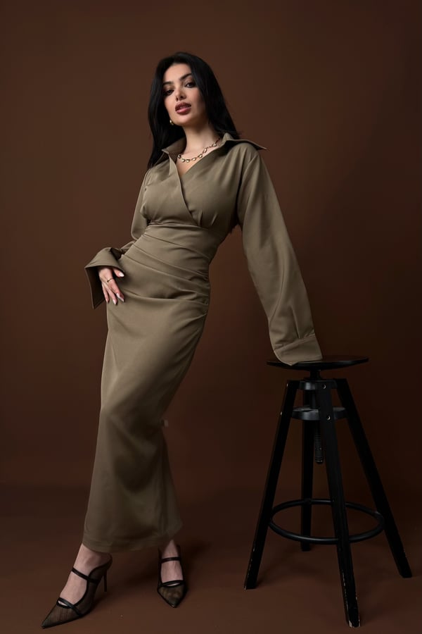 A V-neck collar, long structured sleeves, and a crossover waist that effortlessly sculpts the body. Understated and powerful.