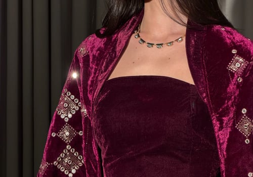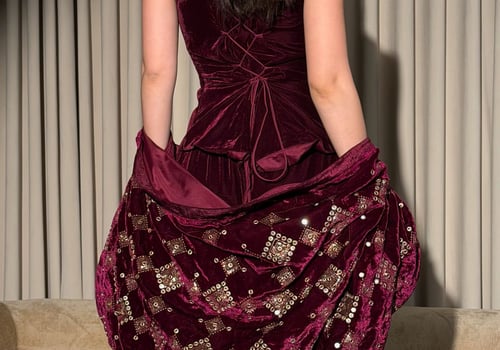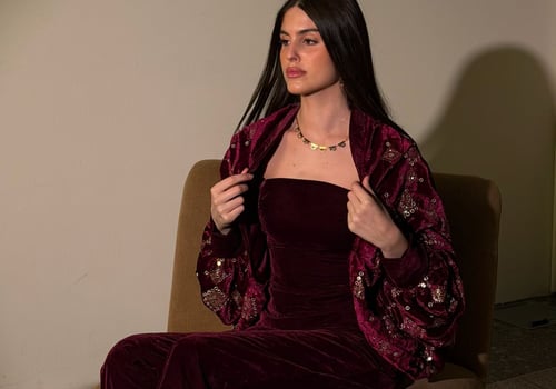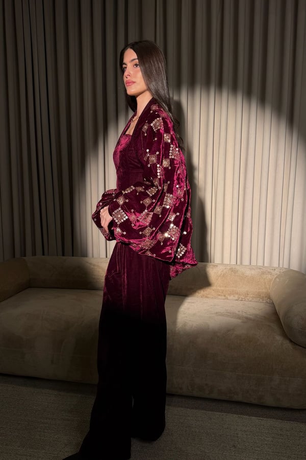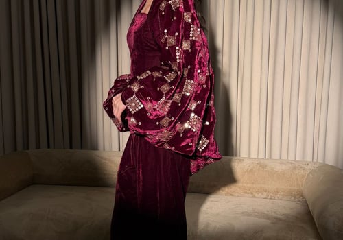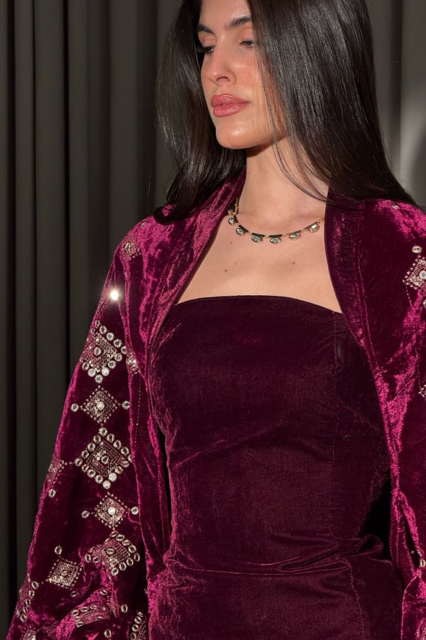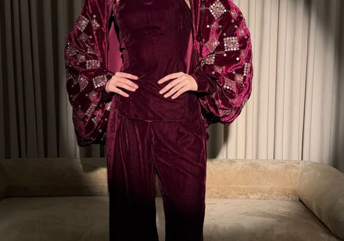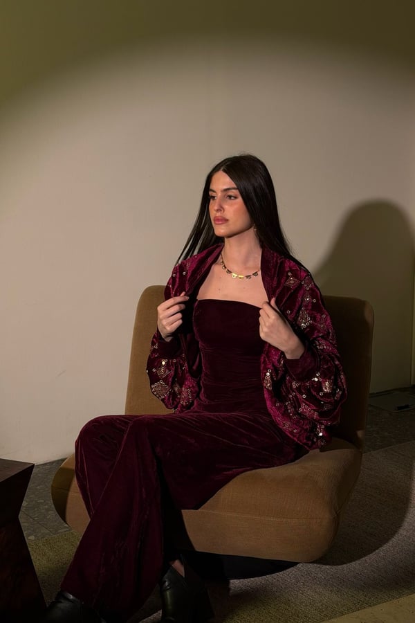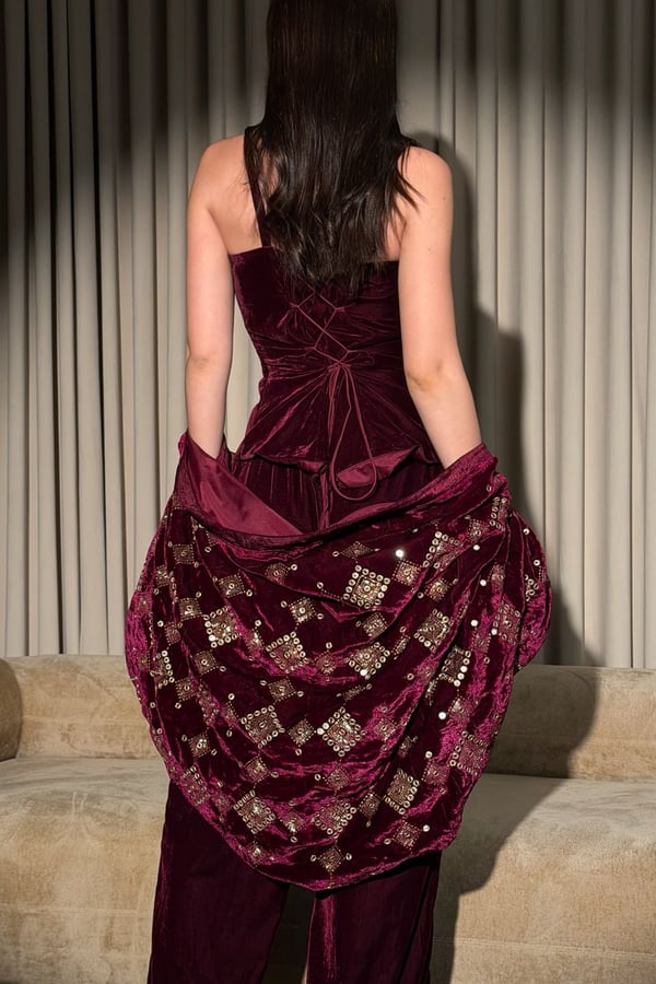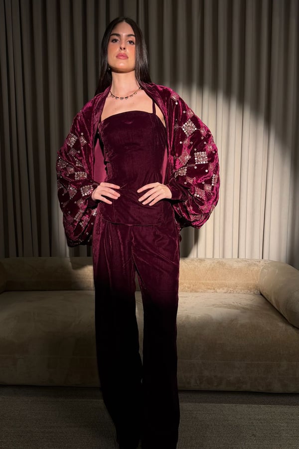 A three-piece velvet composition of tailored pants, a sculpted tube top, and a fluid outer layer.