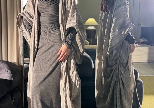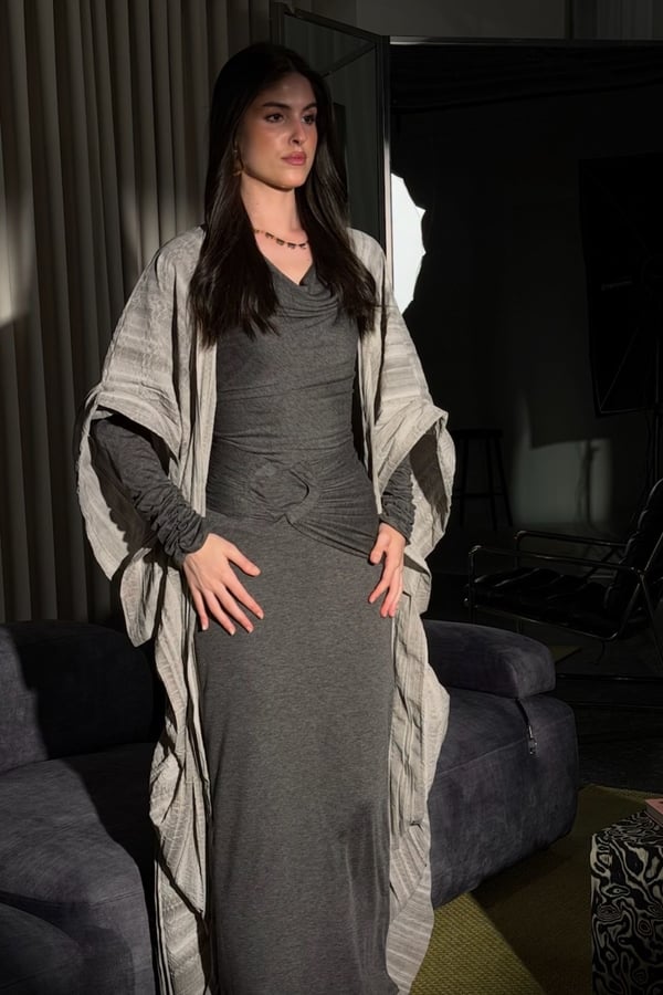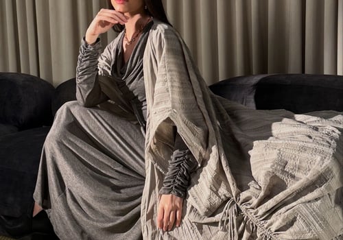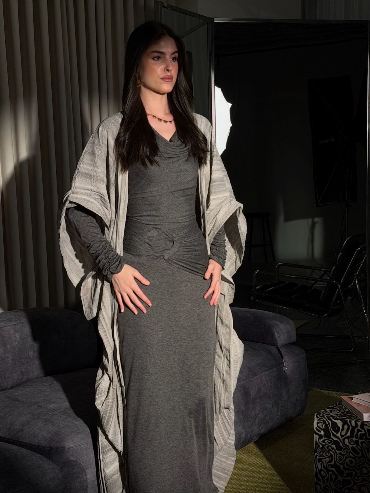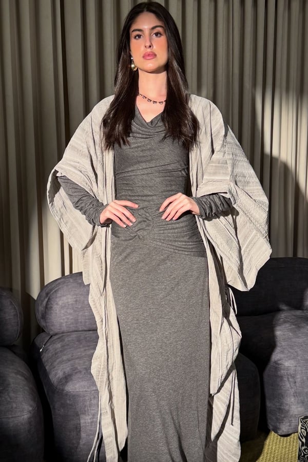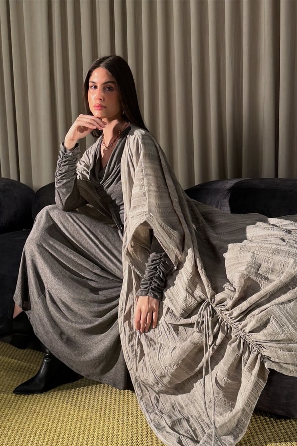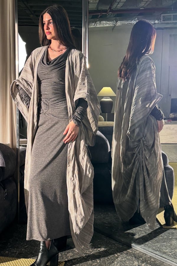 A fitted dress paired with a Himalayan bisht overlay, creating contrast between structure and fluidity.