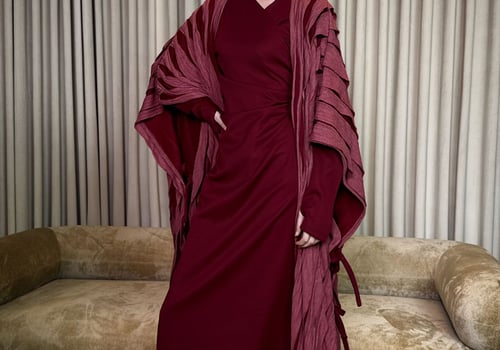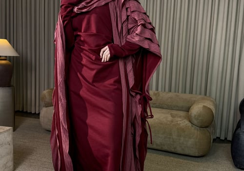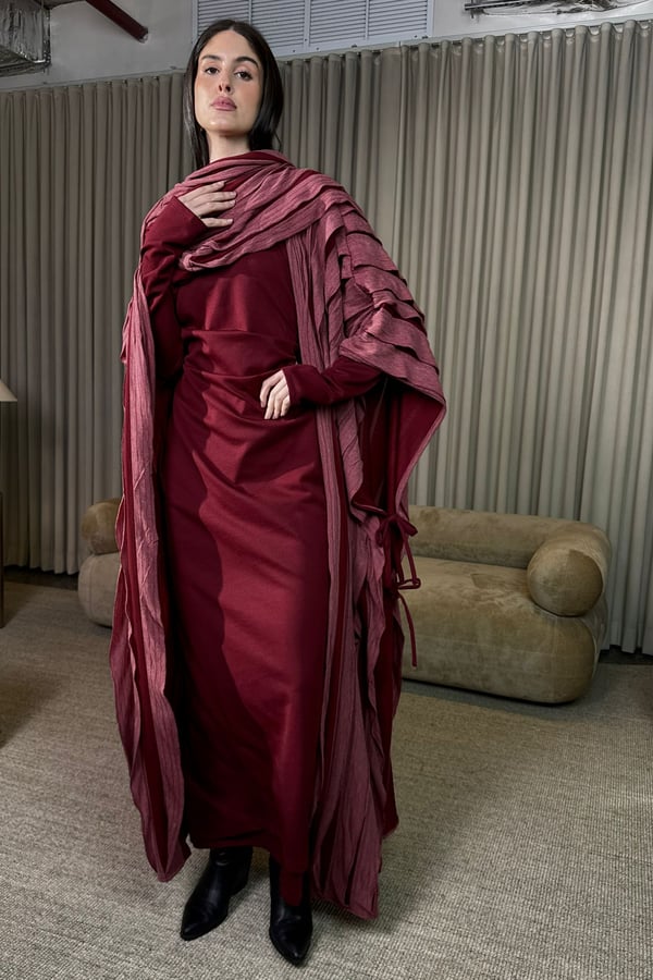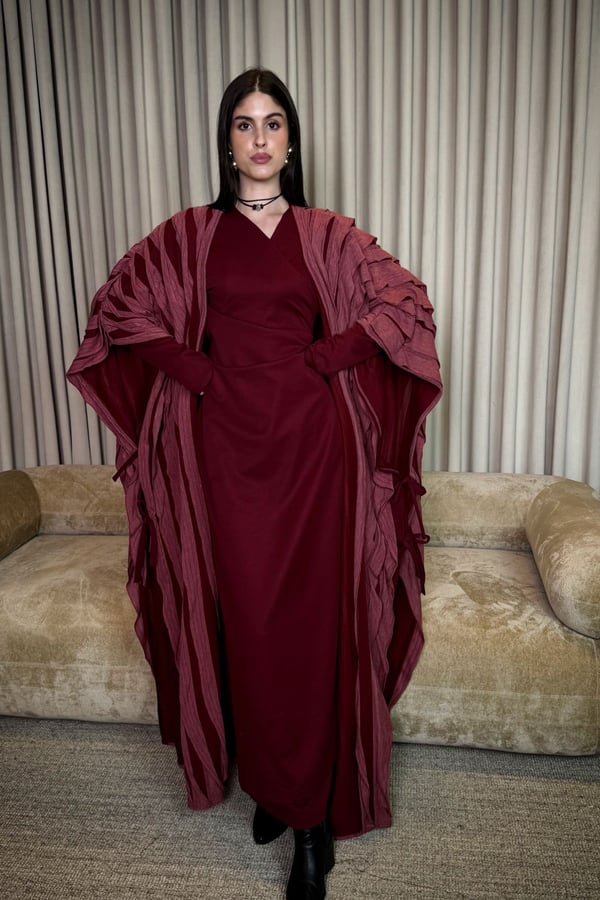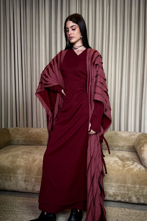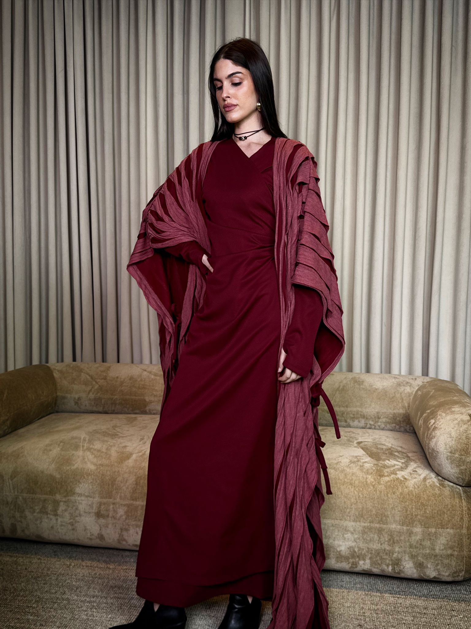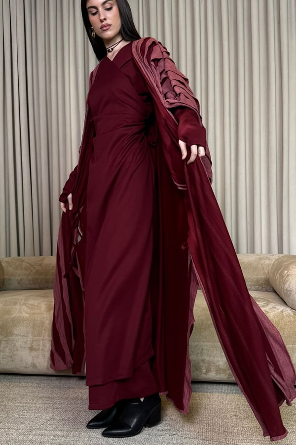 A two-piece free-size wrap dress paired with a versatile bisht overlay.